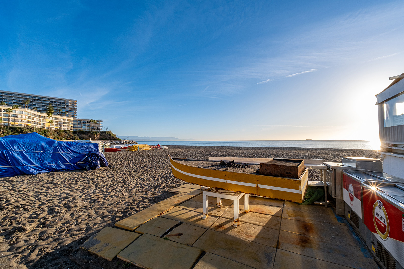 La playa de La Carihuela, de 2,1 km de longitud, está completamente equipada y es accesible en toda su extensión a través de un animado paseo marítimo bordeado de restaurantes y chiringuitos de renombre. La zona está bien comunicada con excelentes conexiones de transporte, incluyendo autobuses locales, taxis y una estación de tren en el corazón de Torremolinos y Los Alamos, lo que facilita la exploración de la región circundante.