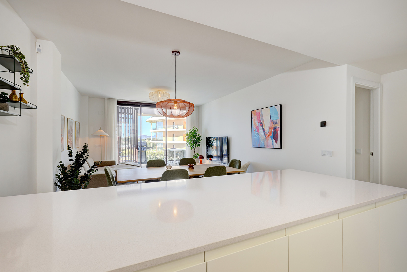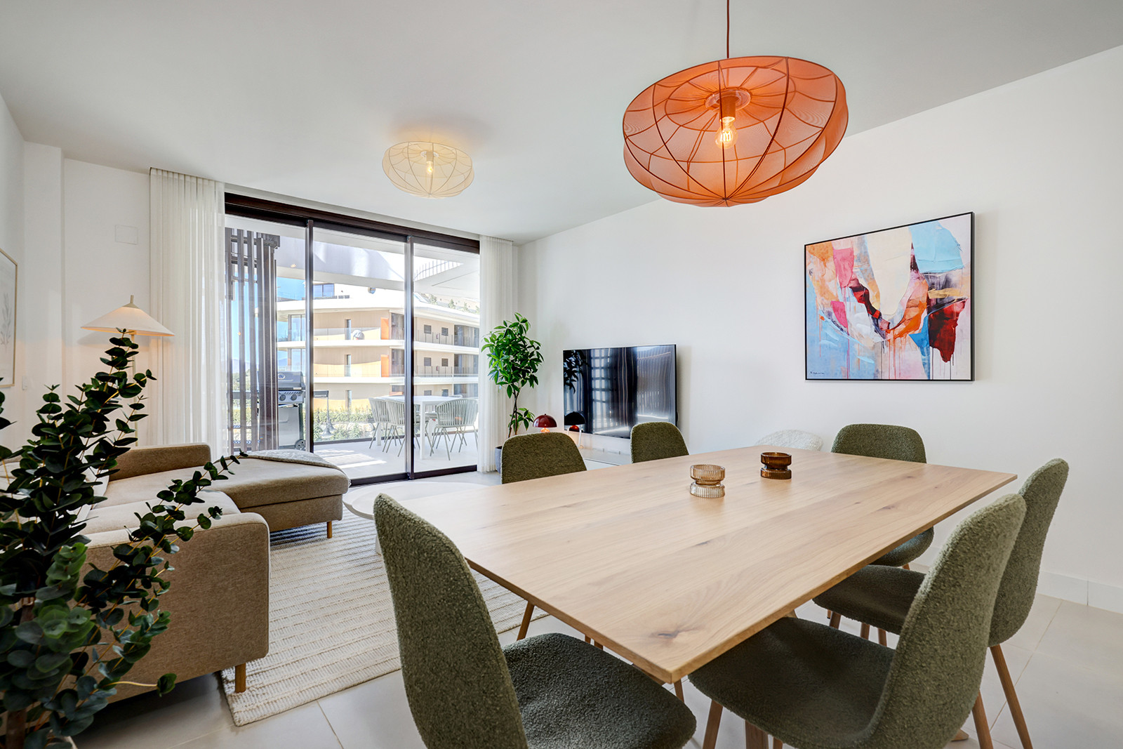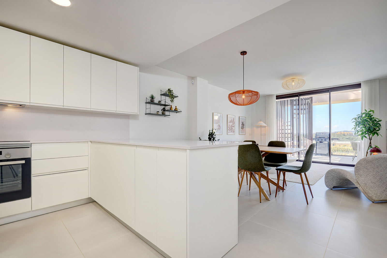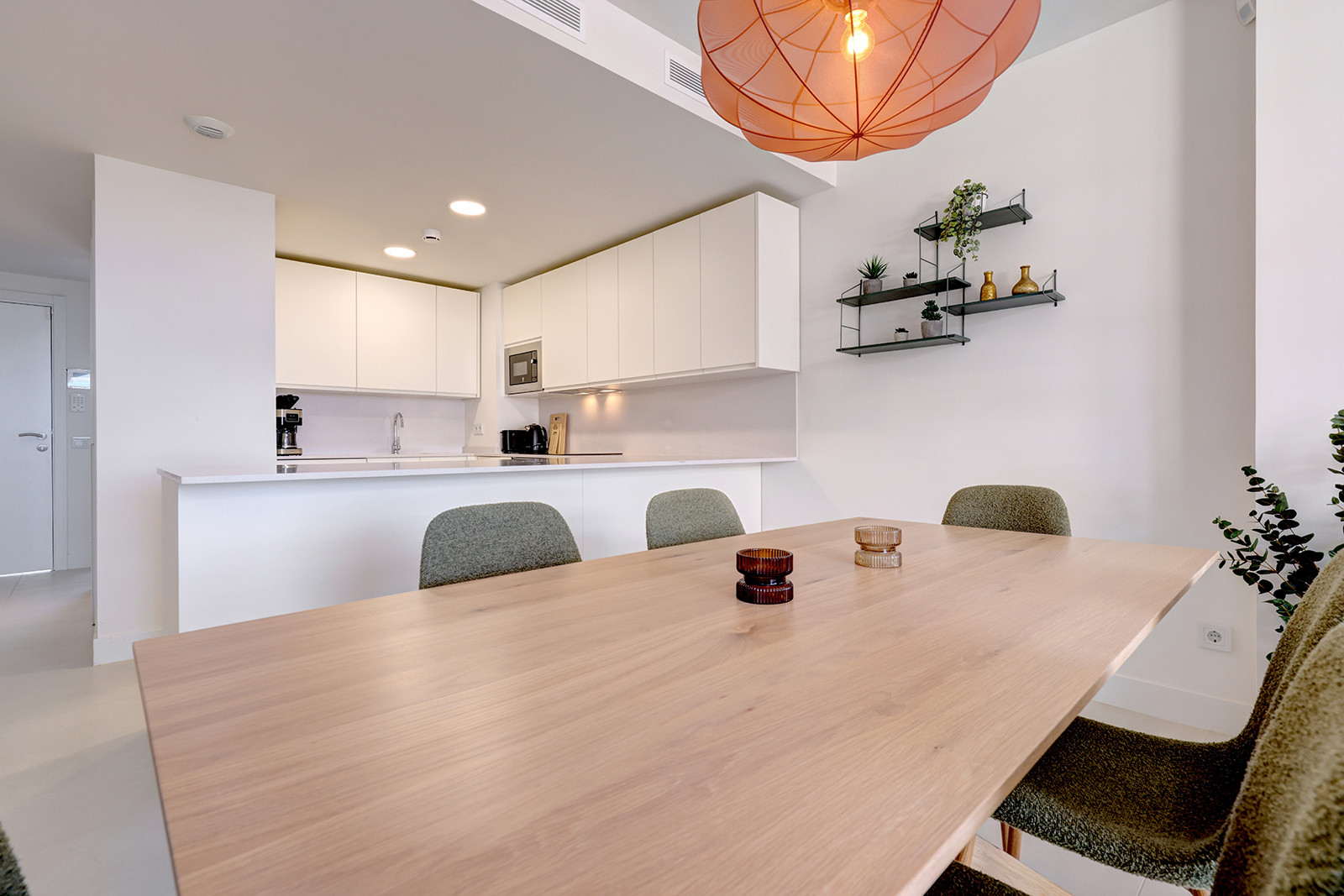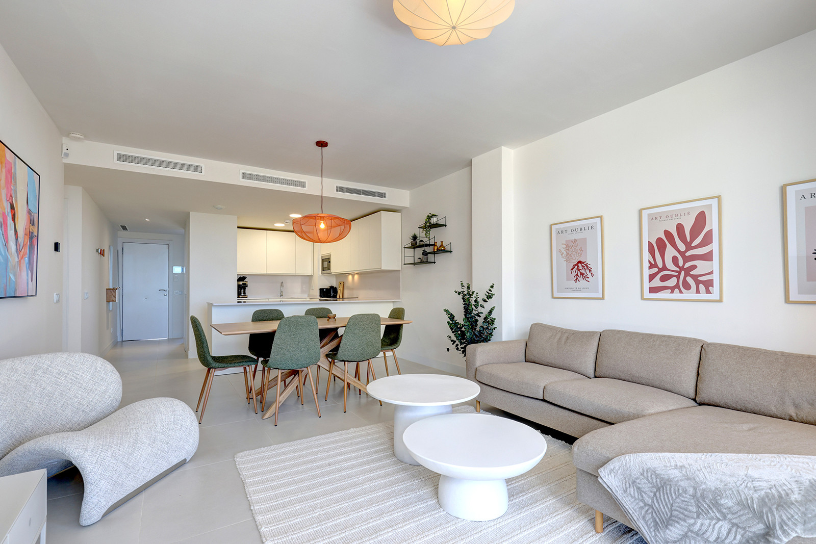 El área principal de estar/comedor es de planta abierta y está amueblada con buen gusto, mezclando hábilmente comodidad con estilo. La luz natural llena la habitación a través de las puertas de terraza dobles que conducen a su terraza privada. El smart TV tiene una serie de opciones de streaming y hay internet wifi en todo el apartamento. El juego de comedor se sienta cómodamente seis. La cocina de planta abierta es moderna y está completamente equipada con todo lo que necesita para una estancia prolongada. Hay una lavadora y secadora, cafetera y hervidor eléctrico, placa de inducción, lavavajillas y frigorífico congelador.