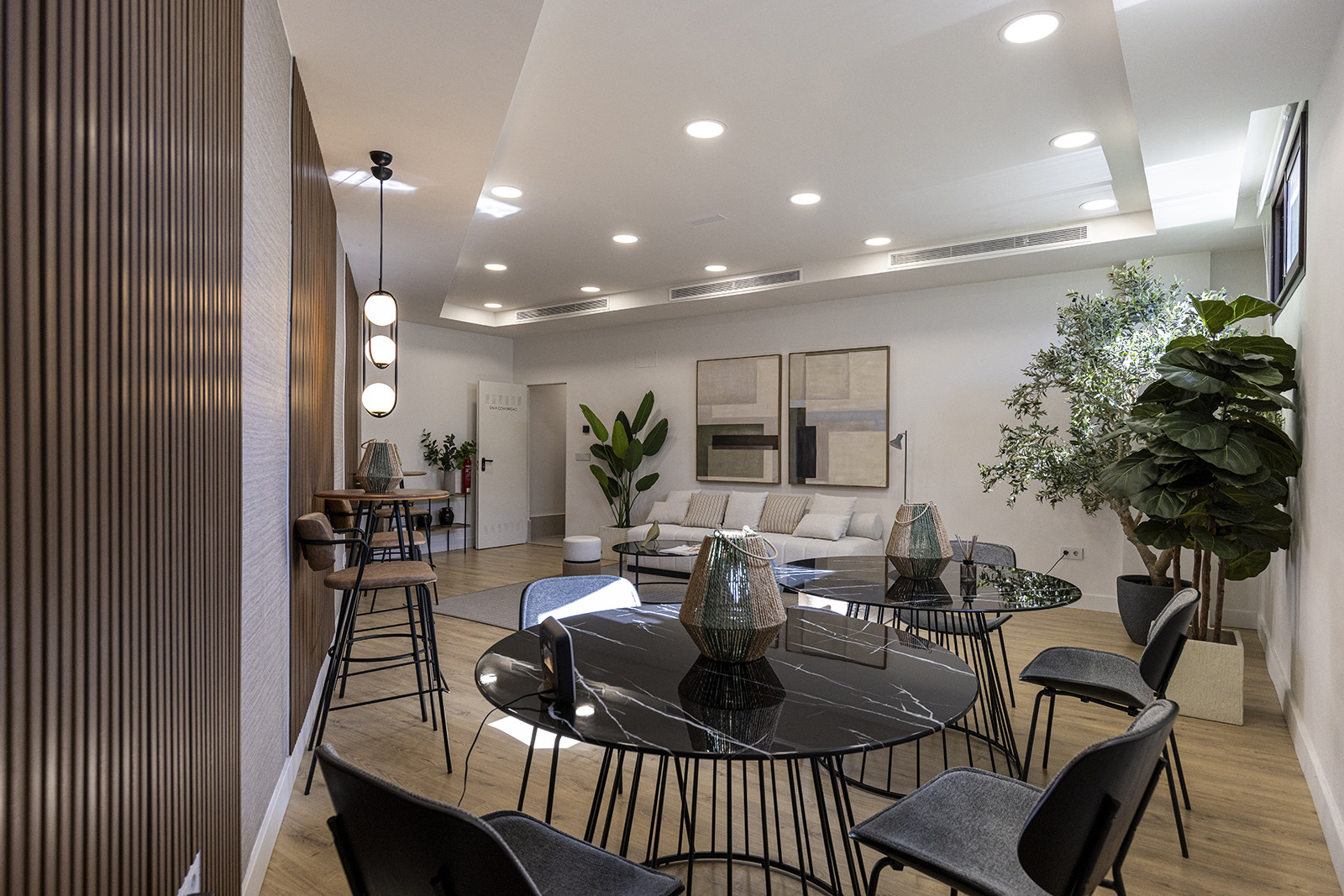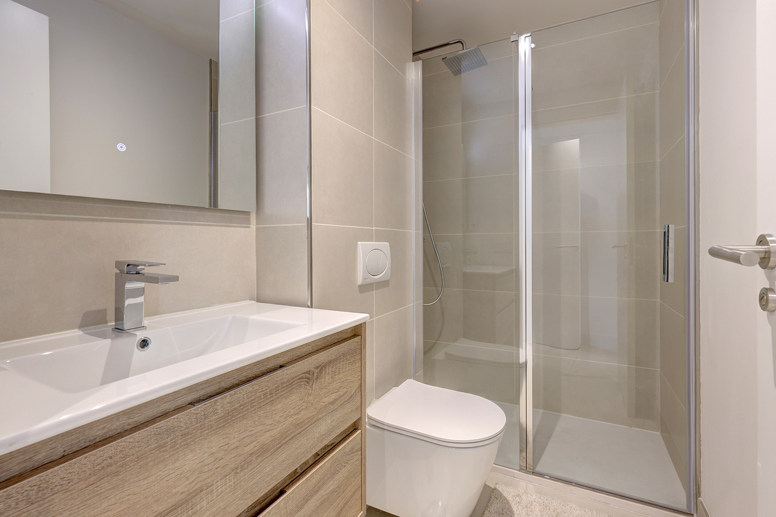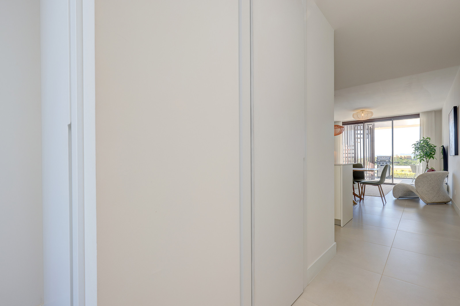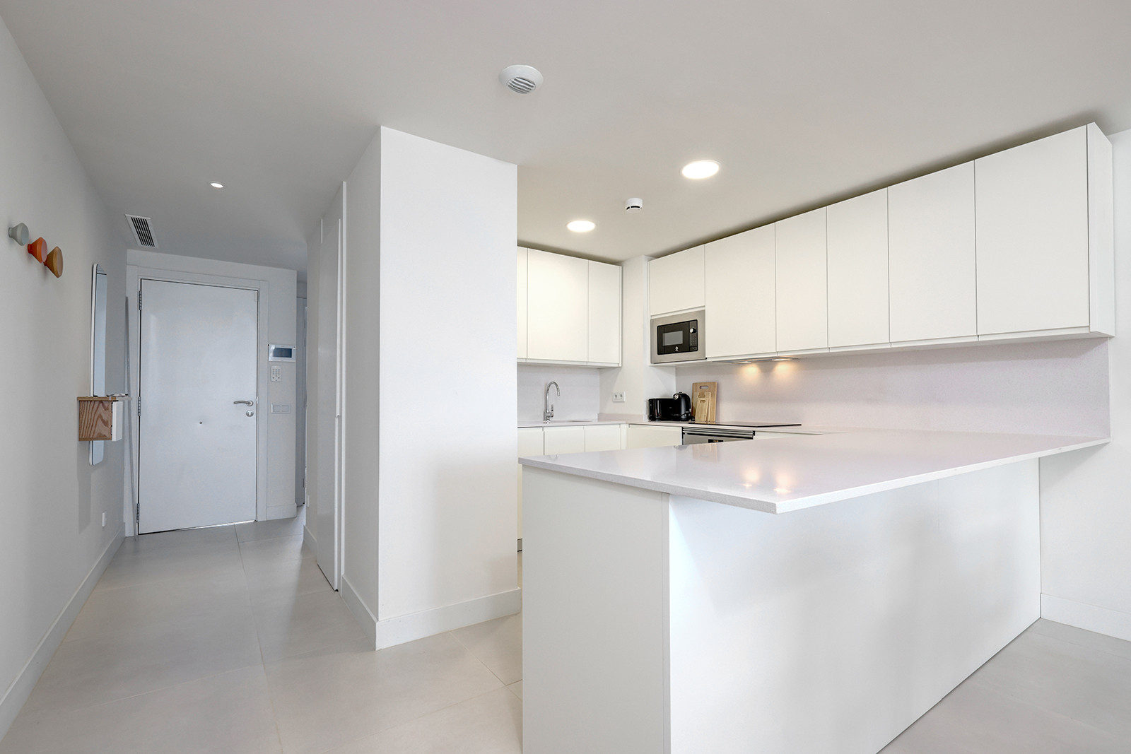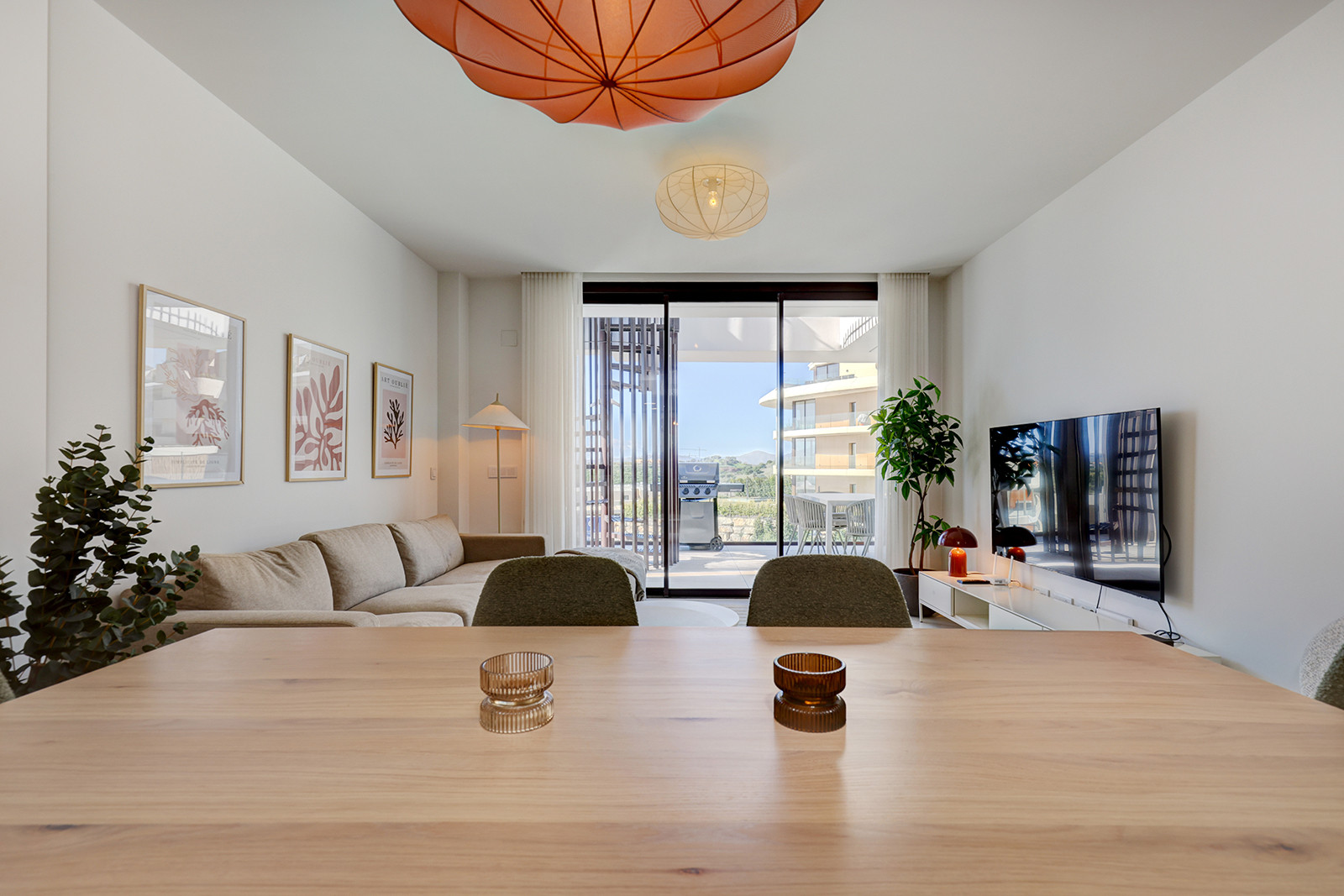 El área principal de estar/comedor es de planta abierta y está amueblada con buen gusto, mezclando hábilmente comodidad con estilo. La luz natural llena la habitación a través de las puertas de terraza dobles que conducen a su terraza privada. El smart TV tiene una serie de opciones de streaming y hay internet wifi en todo el apartamento. El juego de comedor se sienta cómodamente seis. La cocina de planta abierta es moderna y está completamente equipada con todo lo que necesita para una estancia prolongada. Hay una lavadora y secadora, cafetera y hervidor eléctrico, placa de inducción, lavavajillas y frigorífico congelador.