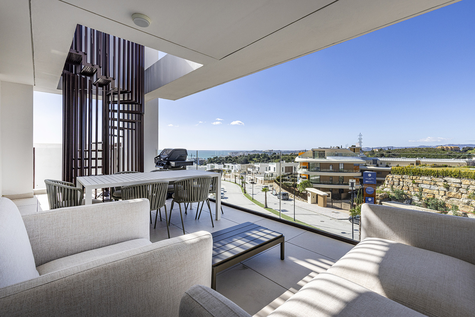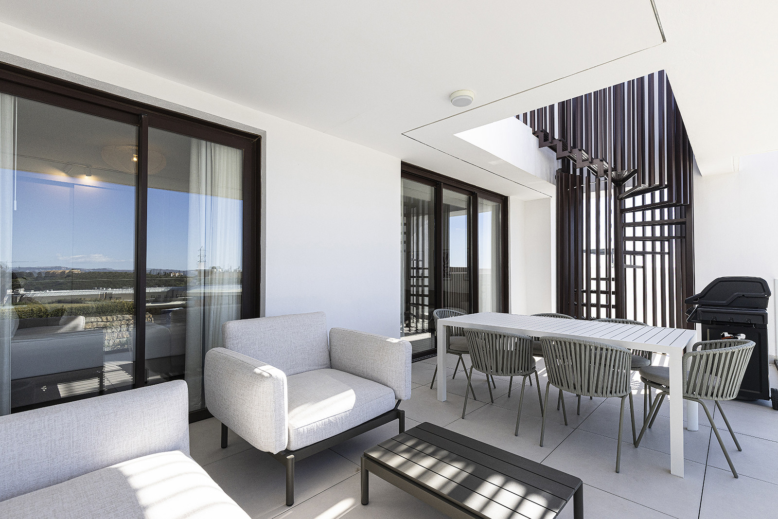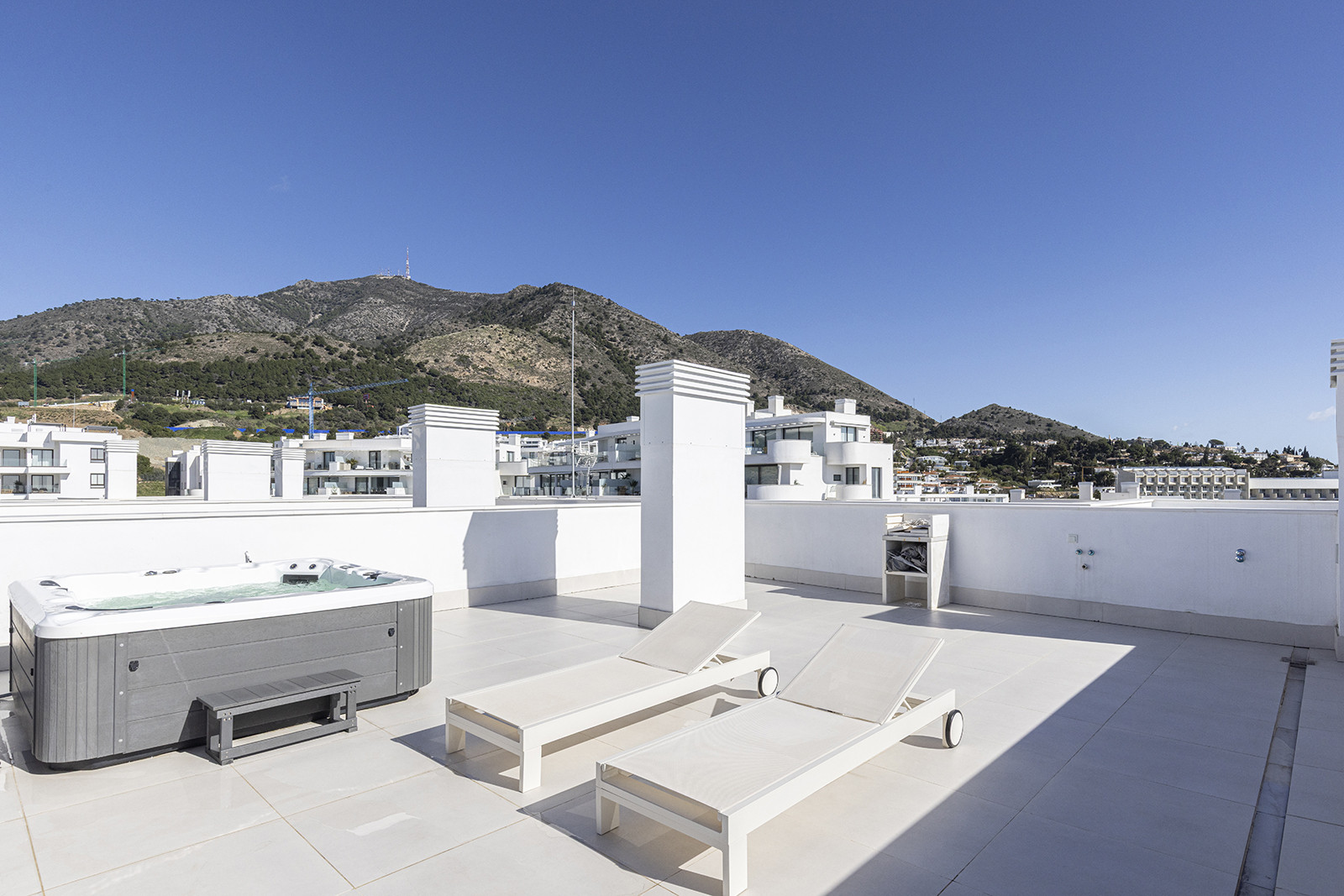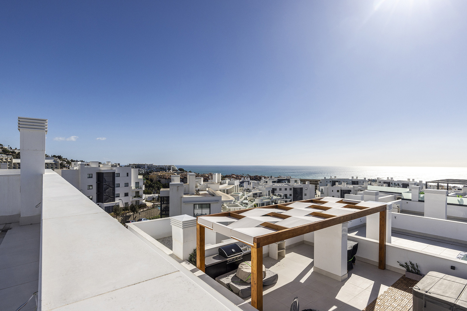 Cuando sales a la terraza desde la sala de estar, encontrarás el conjunto de comedor exterior y la barbacoa. El conjunto de comedor exterior también tiene capacidad para seis personas y hay muebles cómodos para relajarse con una bebida fresca mientras se disfruta de las vistas al mar. También hay una escalera de caracol que conduce a su terraza privada en la azotea. Hay varias tumbonas para tomar el sol y un jacuzzi privado, todo lo cual le ofrece unas vistas panorámicas espectaculares del brillante Mediterráneo y las montañas circundantes.
